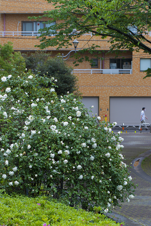すぐ横の遊歩道の白いバラも満開。明日はあれを撮りに行こう。天気悪いといいな。