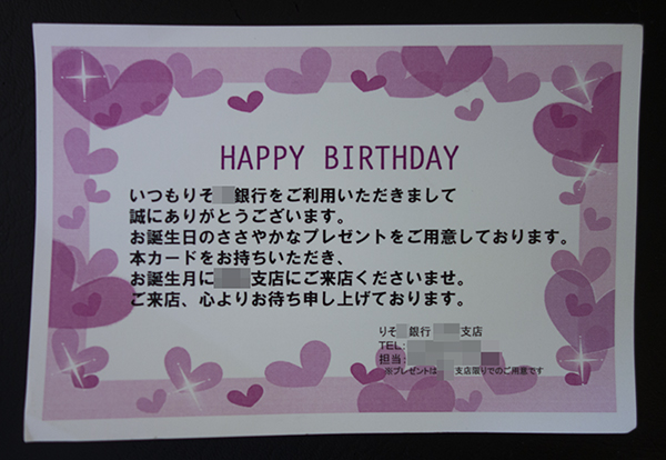 ブロッコリー コメントを残す katoさんちに長野のK山さんちからブロッコリーが届いた。 お裾分けしてもらう。 早速、お昼に軽くゆでていただく(1分半程度) 茎まで美味しかったです(てか、茎部の方が味濃い)ご馳走様でした! 今月、誕生月なんすが、銀行からこんなハガキが届いた。 利息が超低いのに、プレゼントとは…。ティッシュかな? 交通費かかるので行かないけどさー。