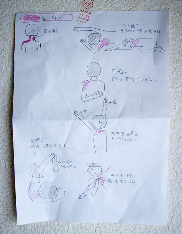 水曜、再び近所の整形外科へ。時世柄、痛みを訴えるために喋り倒すのも憚られるため、痛いところを描く(そして医者に笑われる)。