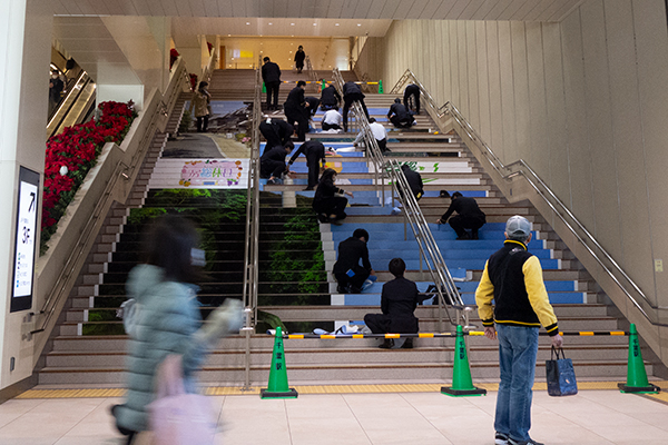 千葉駅で、駅員たちが階段の装飾シールを懸命に剥がしてた……。