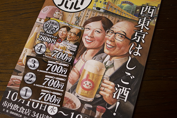 友人バナエさんと、「西東京ジョイバル」西東京市のはしご酒チケット買う。田無駅近の西東京商工会で700円×4枚で2800円。