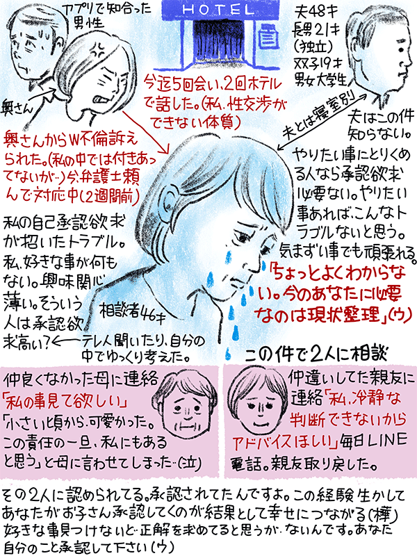 性交渉はないが、アプリで知り合った男性の奥さんからダブル不倫で2週間前に訴えられた。