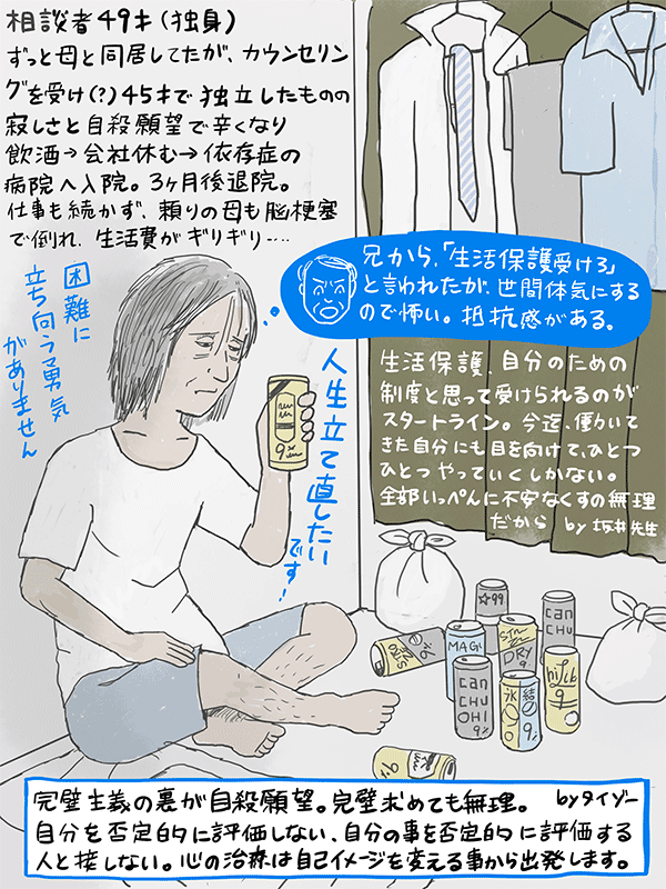 45才で実家を出たものの、依存症(アル中?)になり仕事も続かず。兄からは生活保護を受けろと言われたが抵抗がある。人生を立ち直らせたいけどどうしたらいいかと言う49才男性のご相談。