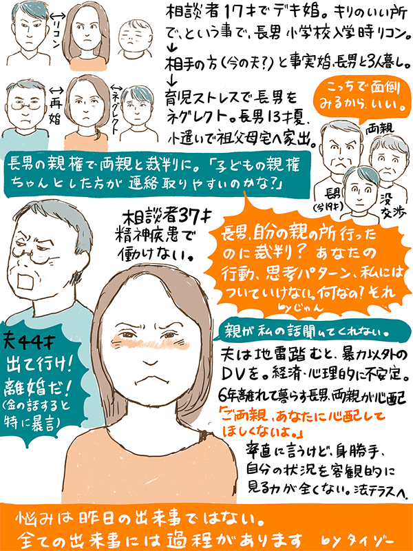 ゆひとさ 2021年7月16日 11:55 PM 相談者さんがジコチューではちゃめちゃなのは言わずもがなですが、とにかく息子さんが逃げて身内に助けられたことに安心しています。ここ数年目にする痛ましい児童虐待による悲しい事件もこうやってギリギリのところで踏みとどまるケースも多いのだろうな…と。 男関係がだらしない、マトモな社会生活を送れず、身内に助けてもらえない状態ならば 公的支援を使って自活するしかないですね。 日本は最低限の保障は整っているのですから。弁護士先生が突き放したように公的支援を…と勧めたのはアンタは子供や実家からの温情など求めるでない!という静かなる怒りが込められてると推測してます。いまさら親の看板振りかざして散々悲しい思いをさせた息子さんに今度はいっぱしの子供の役割を求めて、自分勝手過ぎてイライラしました。が、しかしこのタイプの人間は男女問わず存在していて、いつも幼い子供達が犠牲になります。見捨てるのではなく社会全体でみんなが穏やかに過ごせるように導いたり支援出来る世の中であって欲しいと痛感したご相談内容でした。 今回も冒頭聞き逃したのでイラスト助かりました。ありがとうございます。 返信 ↓