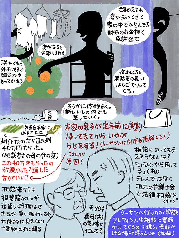 空き家(義母が生前住んでいた家)にひとり暮らしする夫が、定年で実家に戻ってきた本家の息子から嫌がらせ(盗み等)を受けているという。本家の息子は89歳の姉の家にも以前盗みに入っていたとも言う。