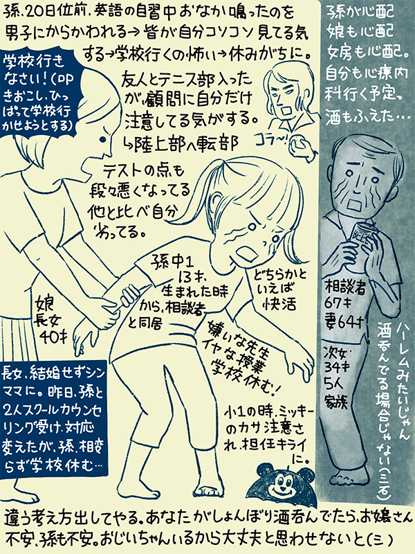 テレフォン人生相談2023年8月24日 2件の返信 自習中お腹が鳴った音を男子にからかわれたのを機に孫の不登校が始まった。 嫌いな授業、いやな先生、それで休む。 娘(孫の母)のメンタルが心配。 自分も酒量が増え、心療内科へ行く予定という67歳男性のご相談。 くわしくはコチラいつもありがとうございます。 お孫さん、中二病っぽい。 三石先生のアドバイス、雑っぽいけどw的確と思った。