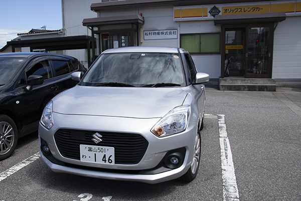 富山駅から徒歩5分強のオリックスレンタカーで車借りた。スズキスイフト、ほぼ30時間借りて保険全部つけ早割サービス予約で¥12771。