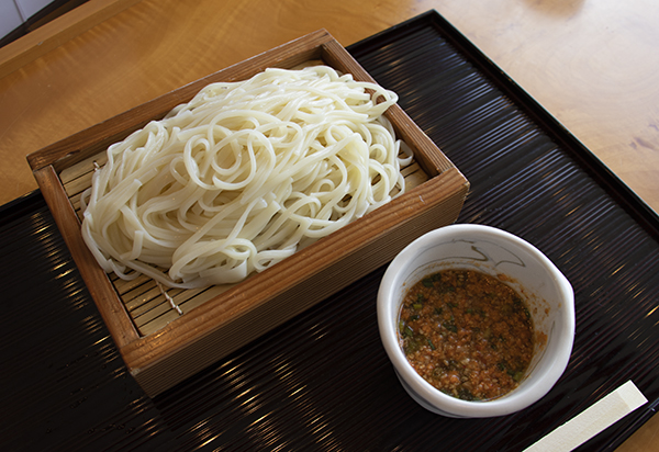富山駅から車で40分くらい(渋滞してた)の氷見うどん「海津屋」で。まゆみちゃんはピリ辛つけ麺¥750.