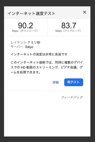 googleの速度テスト。先日の結果よりかなり高速になってた。ダウンロードなんて5倍の速さ。