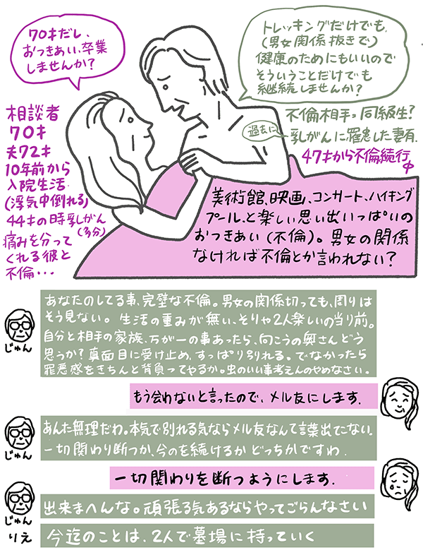テレフォン人生相談2021年4月8日 2件の返信 23年間続けてきた不倫。70歳になった機会に別れようとしたが、相手から男女関係無しで継続を提案される。男女関係なければ不倫とか言われなくていいのかな?第三者の意見が聞きたい70歳女性のご相談。 詳しくはコチラいつもありがとうございます! 相談者、話し方がとっても上品なのに話す内容はゲス。潤先生と相談者の掛け合いが面白いです〜!