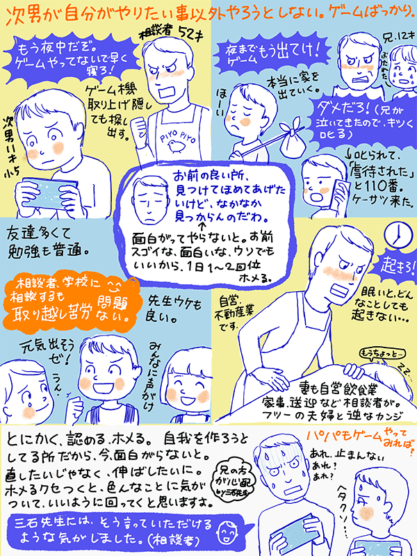 このお父さん、家事も育児もそつなくこなしてるけど、根底には子育ての面倒なことから逃げたい気持ちがあるのかな?と。本当は妻である母親が悩むべきことを何で俺が?と思ってるから次男を見てイライラしてしまう。テレ人では奥さんばかり子供のことで悩んで、夫は関わらないパターン多いですね。今回は男女逆になったようなご相談。