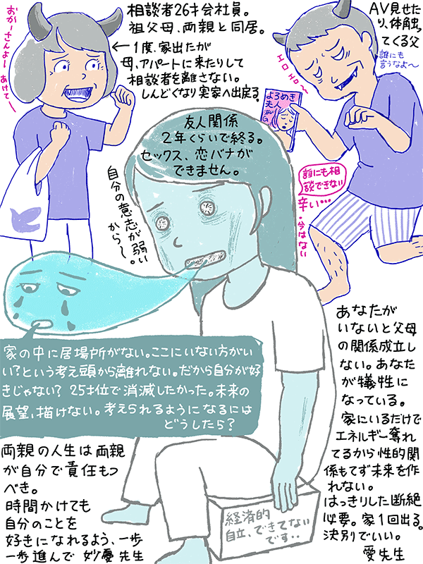 テレフォン人生相談2021年9月8日 2件の返信 男性と友人関係2年続くが セックスできないまま終わる。女友達ともあまり仲良くできない。 未来のこと全然考えられない26歳女性のご相談。 くわしくはコチラ、いつもありがとうございます。 端端に現れる自己評価の低さ、お父さんの虐待のせいでは?! 相談者の意思の弱さのせいじゃないと思う。愛先生も言ってたけど。 エナジーバンパイアみたいな毒親から、早く離れられる手段を見つけられますように。