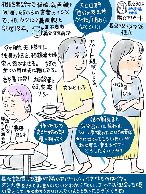 18年間別居したが、9ヶ月前、夫が勝手に独居の姑を家に呼び寄せ同居始めた。