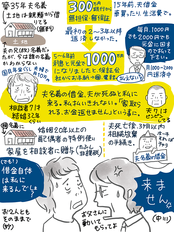 5〜6年前に保証会社から元金と利子で1000万になったと連絡が来て、それ以来月に1〜2000円は返済してるが、夫が亡くなったら借金が私のところに来た上に、今住んでる家も取り上げられるのでは?という71歳女性のご相談。
