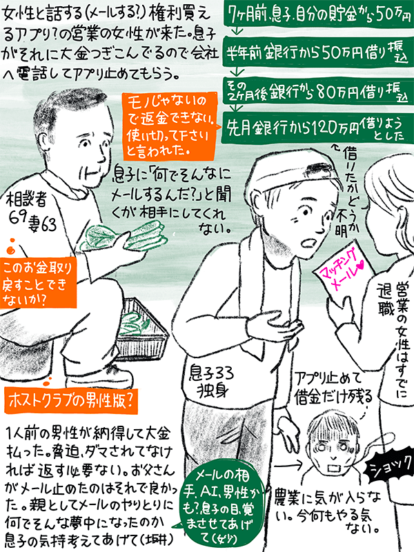 お金を振り込んだが借金だけ残り女の子と話せない。息子が農業も何もやる気をなくしてしまっている。