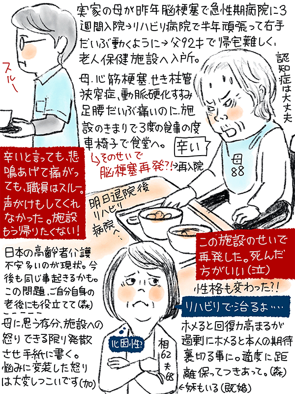 母が昨年脳梗塞に。父も92と高齢のためリハビリ病院退院後は老人保健施設に入所してもらった。