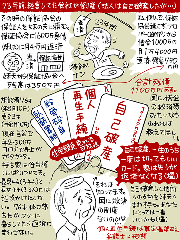 自分も年で体力もなくなり、コロナ禍で自営の売り上げは年2-300万とガタガタ。国に借金の救済策みたいなものあったら教えてほしいという76歳男性のご相談。