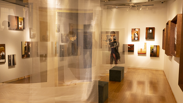 厚みのあるパネルや枠を使用してるので、ライティングで出来る影が作品に新たな余韻を生ませてるような。何とも印象的な空間。