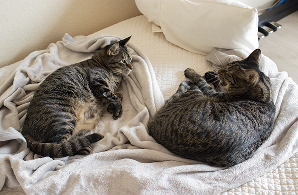 最近夜涼しいのでヨーカドーで1000円の薄い毛布買った。が、朝起きるとネコらが毛布を占領してるのだった。