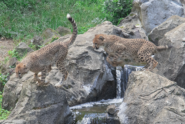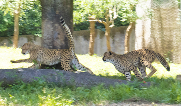 チーターの大放飼場で遊びまわる様子をしばらく見学。が、暑くてかなわんー!