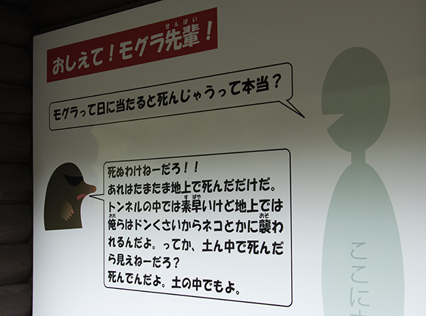 小屋の中に土入りのケースとパイプが張り巡っていて、動くモグラを観察できる。モグラを探すのがかなり楽しい。