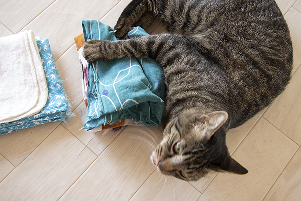 久々晴れ間。とりこんだ洗濯物を荒らす猫…。自由すぎる。