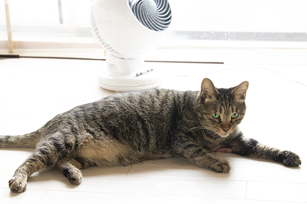 今年初冷房。タマコが大喜び。脇を舐めすぎてハゲが、病院行く?