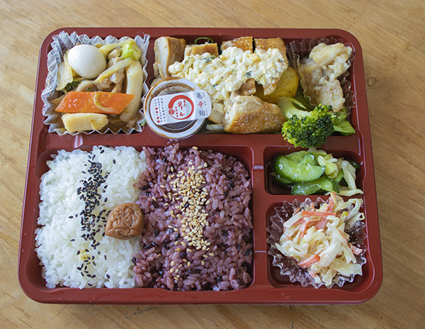 と白米+古代米。升本の「亀辛麹」付き(油淋鶏にかけると旨い)。ガッツリ系でも満足な量だと思う。(&美味い)