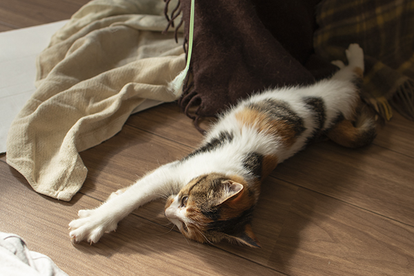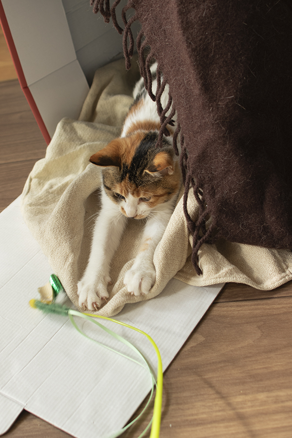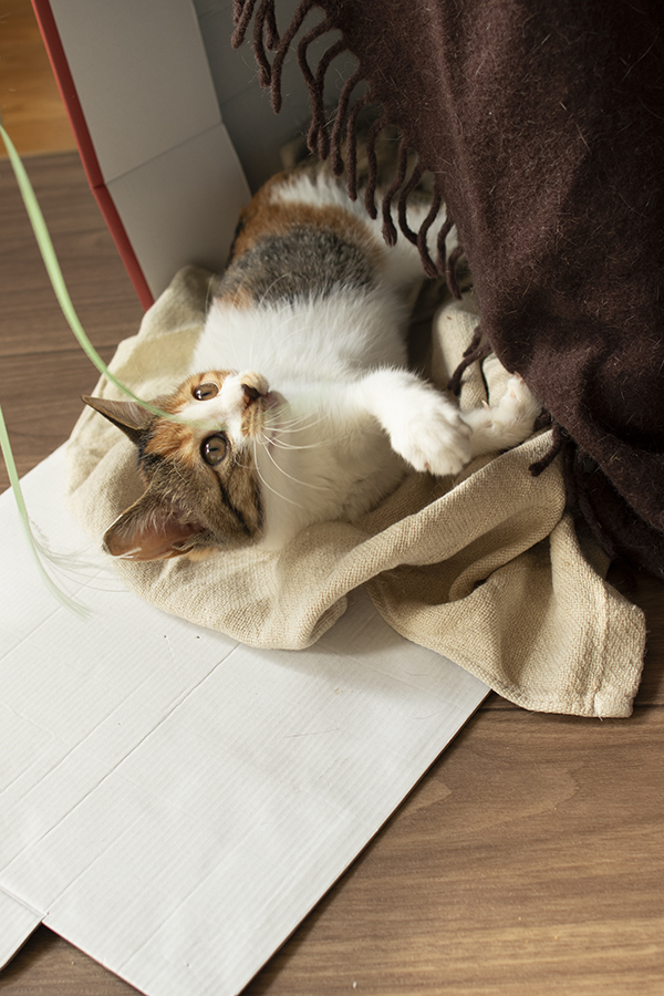今日も「じゃれ猫ブンブン」に食いつく濃三毛ちゃん。