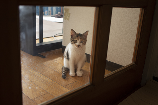ガラス戸からキッチンを覗く濃三毛ちゃん。ビーたんに脅されるよ!