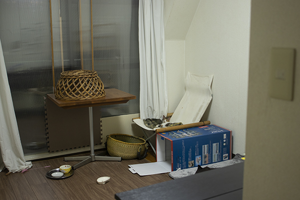 テーブルの上のカゴが落ちてたり。昨日は水のボウルがひっくり返ってました。