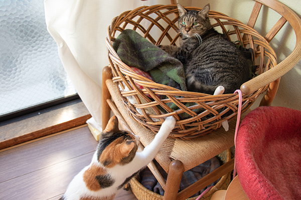 タマコの尻尾にジャレるミケーネ。仔猫っぽ〜い。