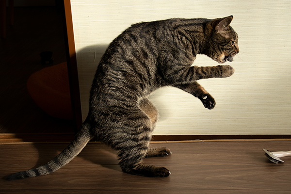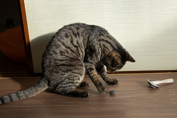ブラッシングの抜け毛で毛玉を作るとビーたんのいいオモチャに。
