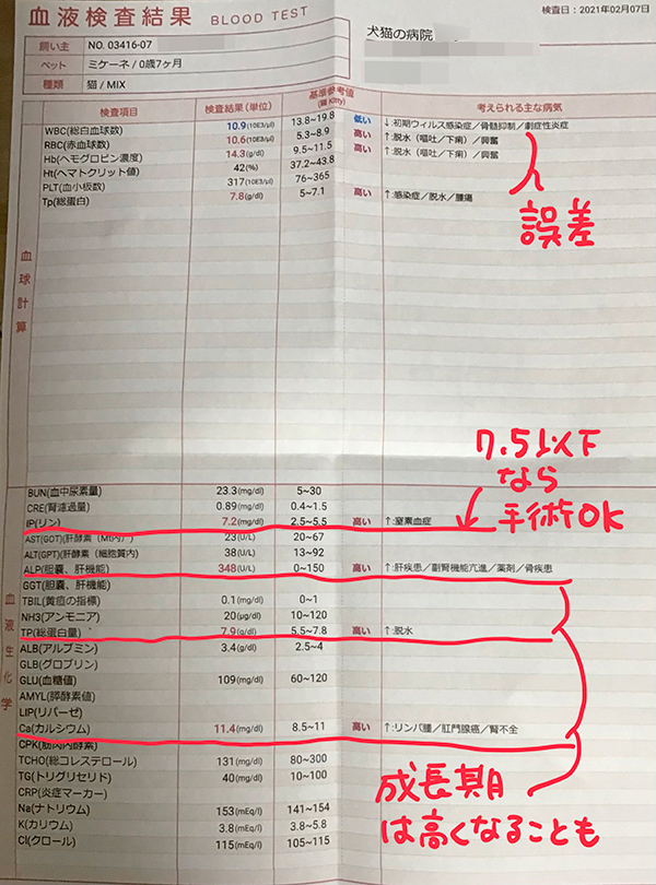血液検査(麻酔が大丈夫か確認)とレントゲン検査。
