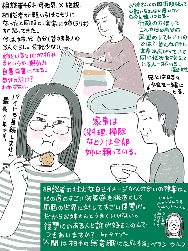 相談内容よりも、この3人暮らしの収入源が気になった。兄と姉で、就労経験の少ない引きこもりの妹を食わしてるんだろうか?