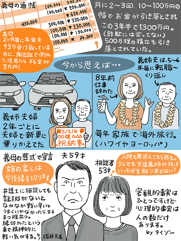 亡くなった義母の通帳残高が3万円だった。義姉が義母に引き落とさせていたと思うが、少しでも今まで姉が持っていった分を取り戻す方法はないか?という53才女性のご相談。