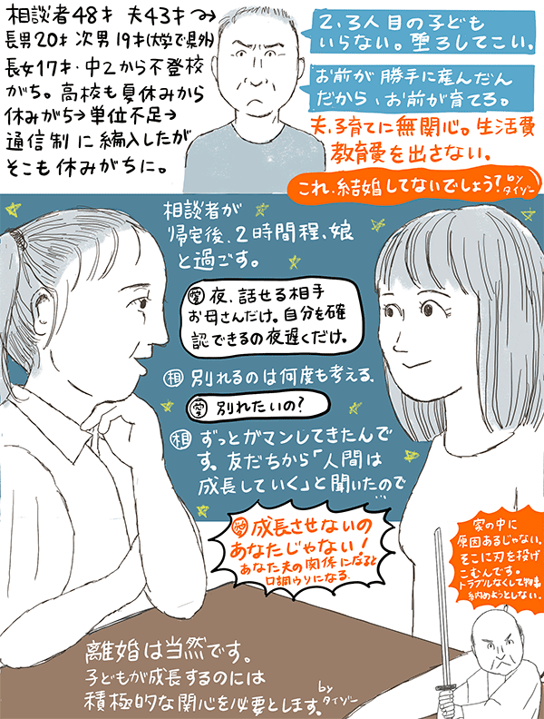 17才の長女が不登校。家庭に問題があり、子育てに無関心で生活費も教育費も入れない夫はどうにもならないと思っているが、今後どうすれば娘にとって一番いいのかという48歳女性のご相談。