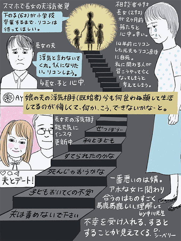 夫の浮気が発覚後、長女が2ヶ月前に孫たちと自殺してしまい辛い。夫の浮気相手のインスタを見たら今も何食わぬ顔で生活してるのが悔しくて、何か出来ないか?という49歳女性のご相談。