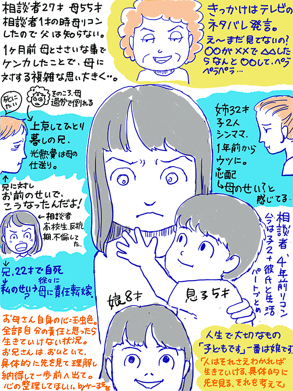 最近母とささいなことでけんか。基本的に母と私と姉、仲はいい方だけどこの喧嘩で自分の中では母に対する複雑な思いが大きくなってしまったという27歳女性のご相談。くわしくはコチラいつもありがとうございます。