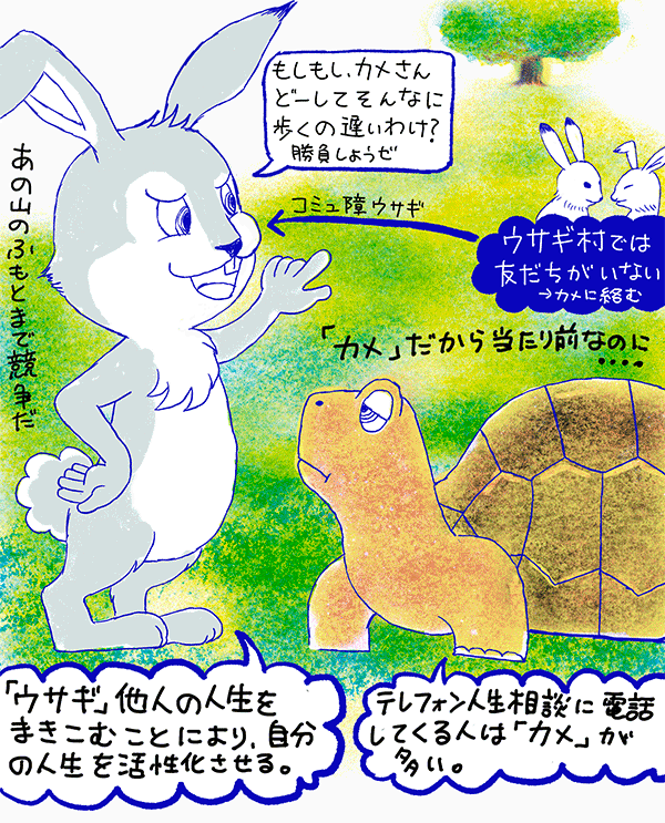 諦三先生の「ウサギとカメ」の新解釈?が印象的だったので描いてみた。