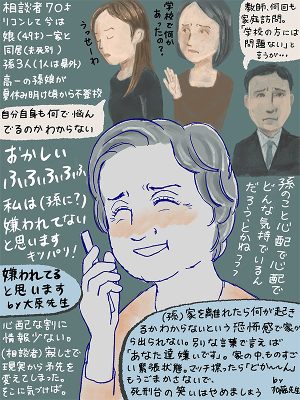 高校一年の孫娘が学校に行きたがらない。理由を聞いても本人もわからない、学校のこと話すと切れて話にならない。自分から見れば家族の関係は普通だと思うのだがという70歳女性のご相談。
