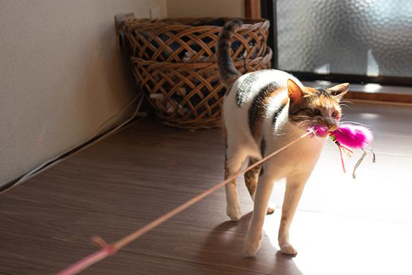 くわえたオモチャを離さないミケーネたん。唸ってる。