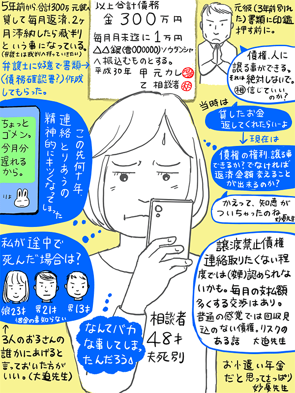 この先何十年と連絡とりあうのが精神的にキツくなってしまい、債権を譲渡か返済額を変更することはできるのか?という48歳女性のご相談。