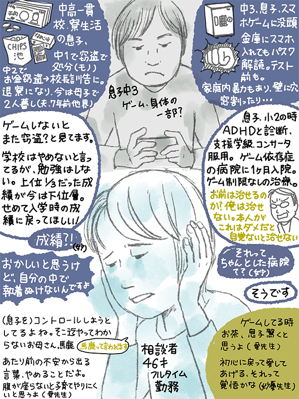 寮生活していた息子(中三)が窃盗を繰り返し校長訓告、寮に居られなくなり母子二人暮らしをしているが、勉強もせずスマホゲームに没頭。成績も下位層まで落ちたが、せめて入学した時くらいの成績に戻って欲しいという46歳女性のご相談。