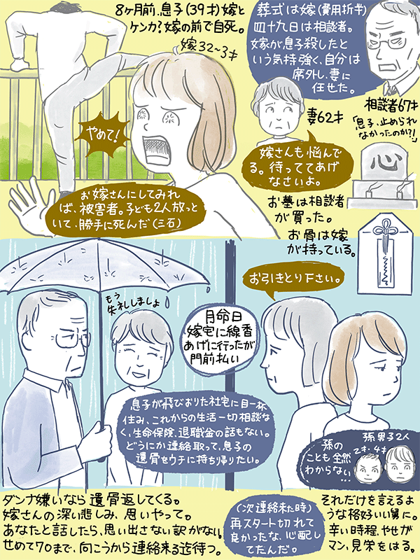 8ヶ月前、息子が自分の妻の前で自死。相談者自身、嫁が息子殺したという気持ち強かったが、嫁も「お父さんわたしが息子殺したと思ってるんでしょ」と言ってるらしい。