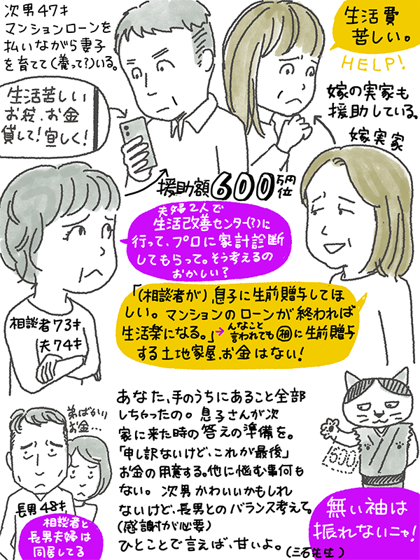 別世帯を持つ次男にトータル600万援助しているが、嫁の実家が「(相談者が)息子に生前贈与してほしい」と言ってきた。こちらも裸一貫でやってきたので、生前贈与するお金も土地家屋もない。