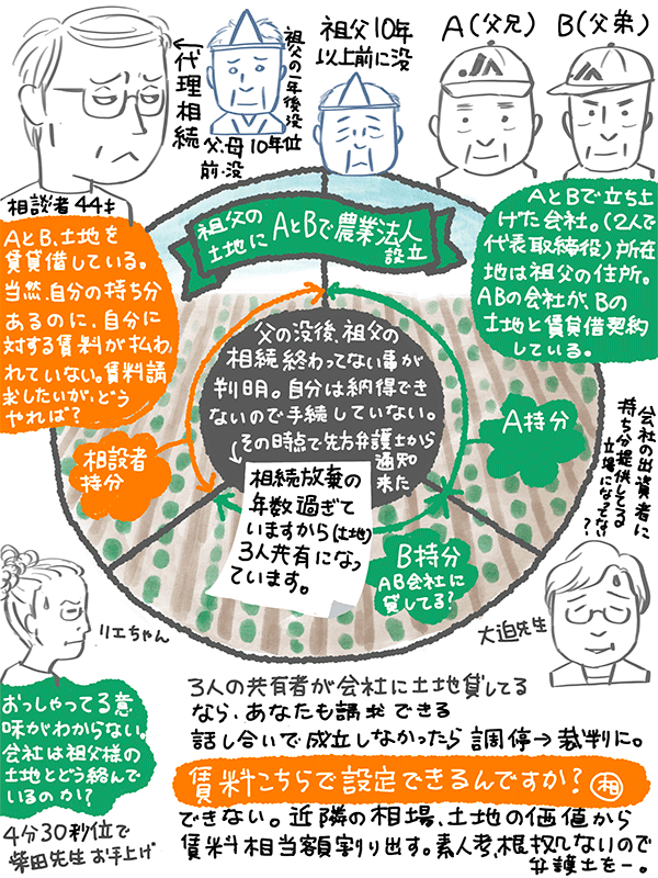父の兄(A)と弟(B)が祖父の土地(相談者とAとBで共有)で農業法人をやっているが
