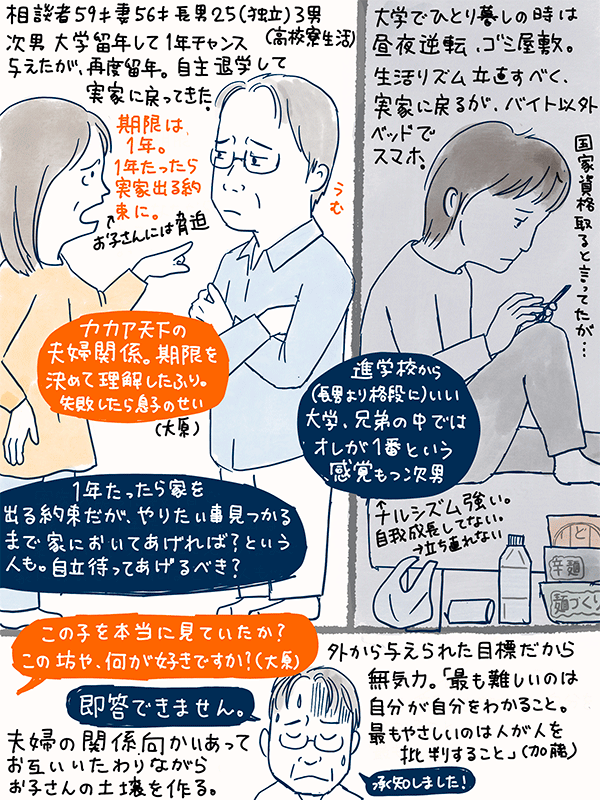 実家に戻り1年後には実家を出てもらうと期限決めているが、やりたいこと見つかるまで家においてあげれば?という親類も。自立を待ったほうがいいか?という59才男性のご相談。