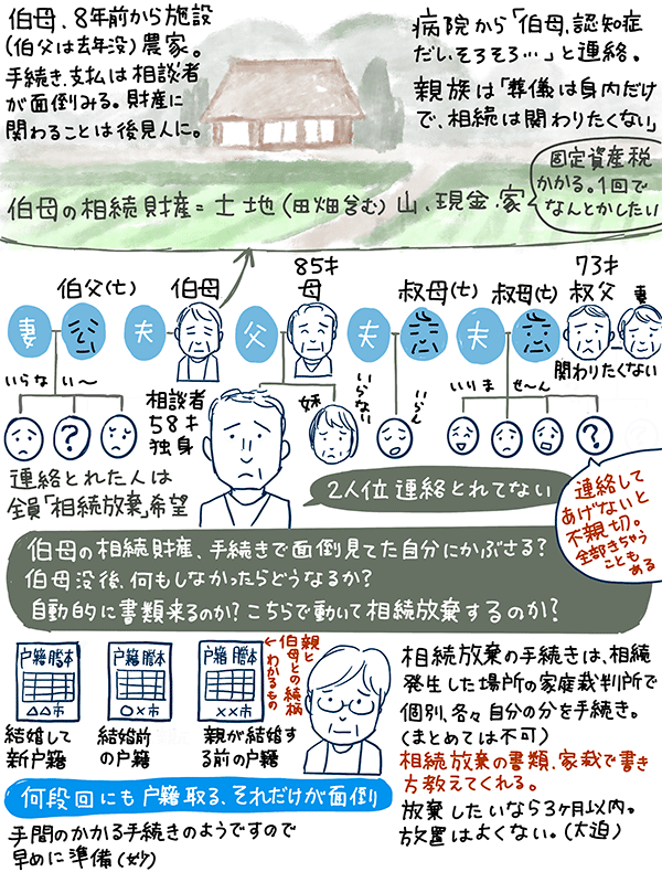 叔母は土地、山、現金、家の相続財産があるが親類は誰も相続に関わりあいたくないと言っている。