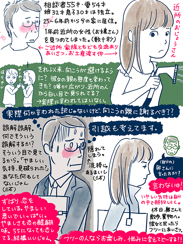 1年前、近所の女性を見つめてしまってから、彼女と彼女の家族の態度が変わってきたような?近所から白い目で見られてるような?はっきり言われた訳ではないが彼女の親に謝るべき?という55才男性のご相談。